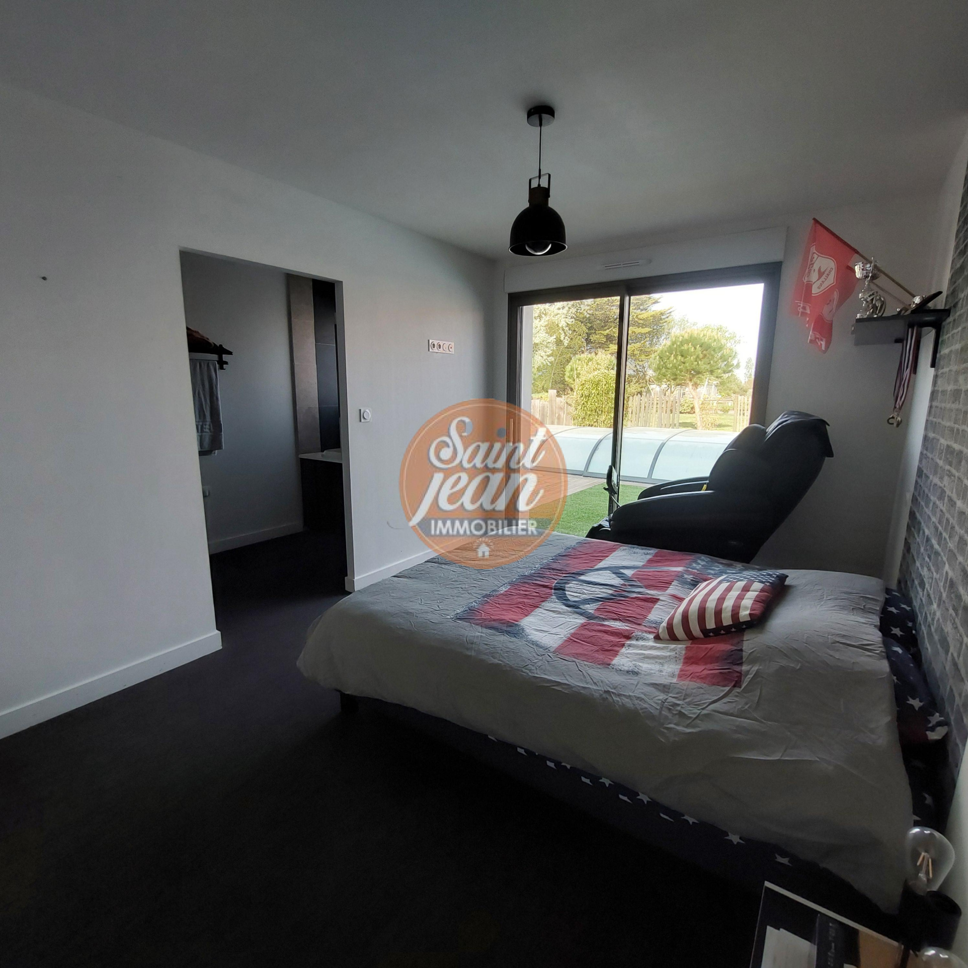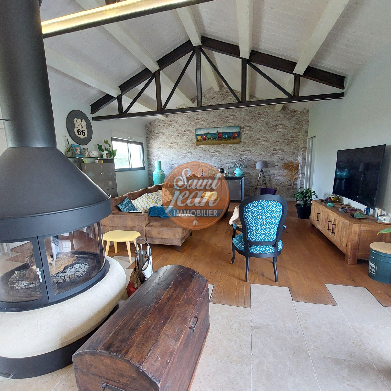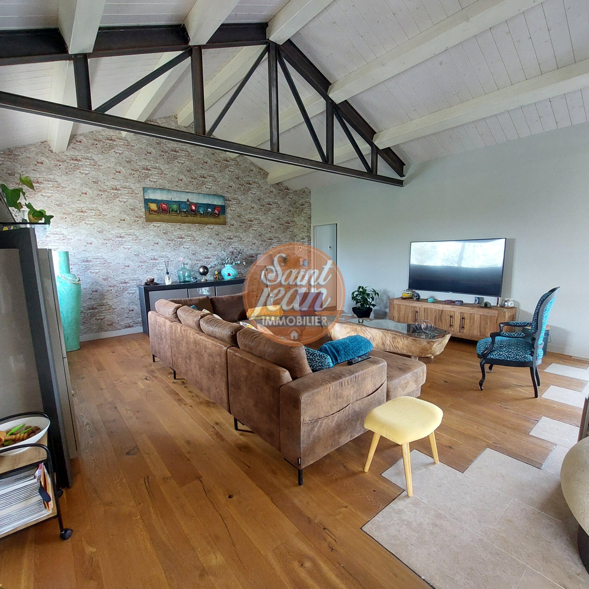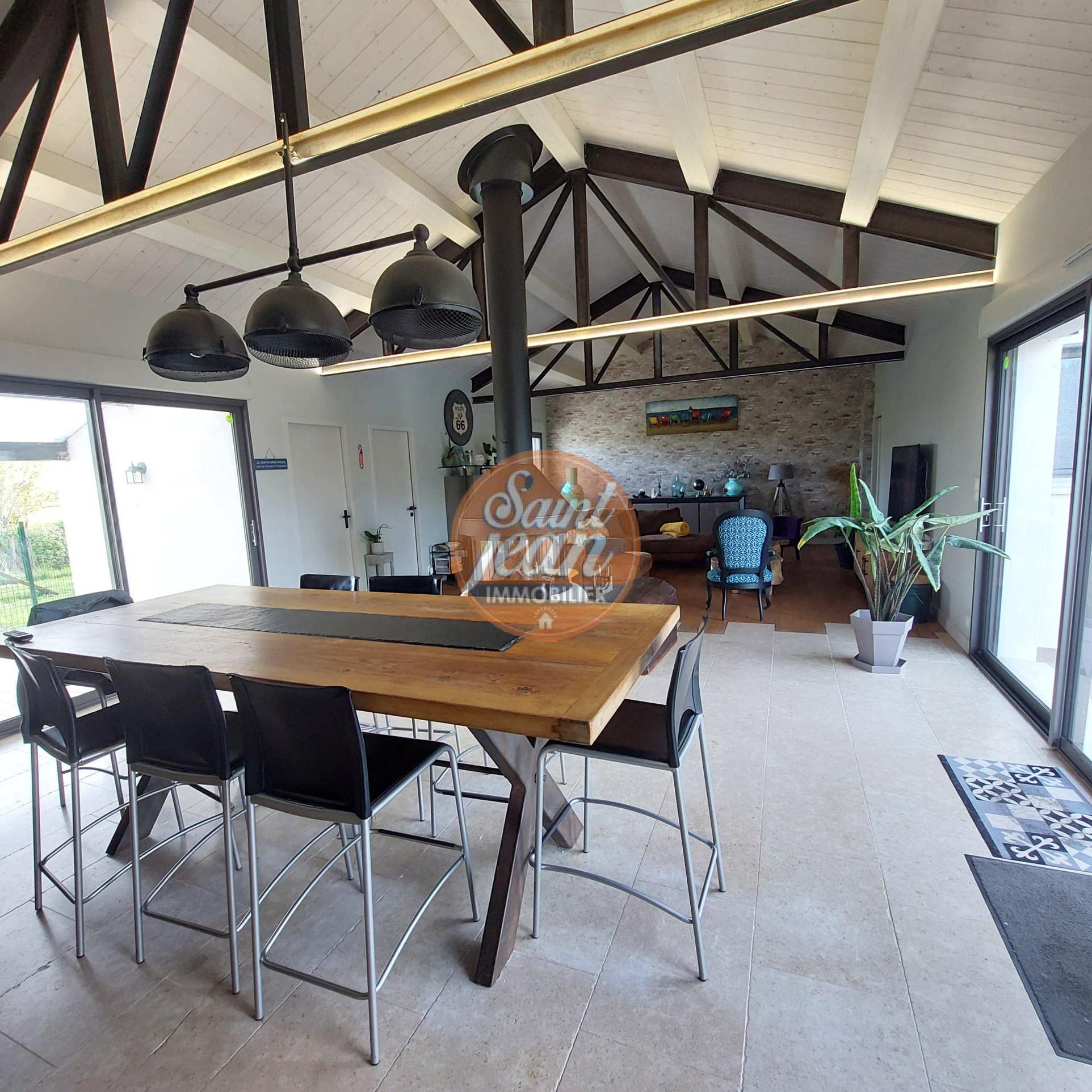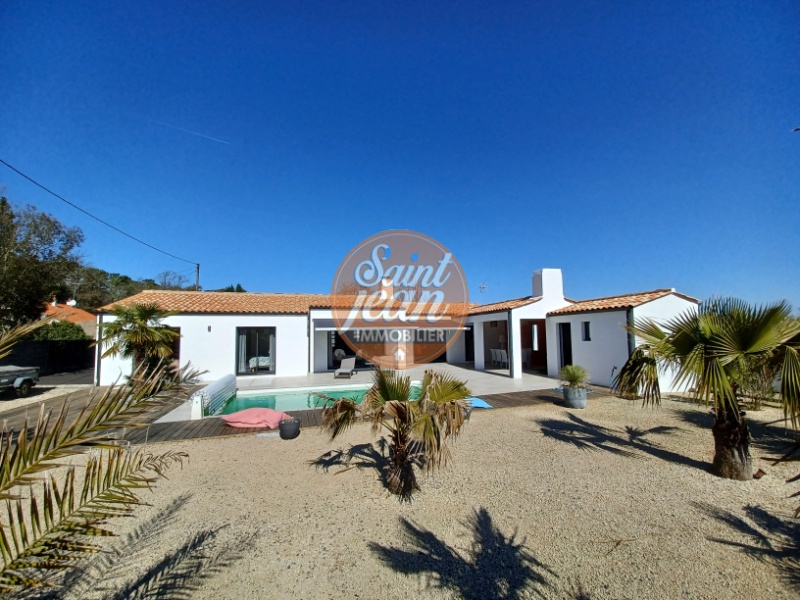 A seulement 3 mns des hypermarchés de St Jean de Monts, magnifique propriété de 180 m² comprenant une spacieuse pièce de vie avec cheminée centrale, une suite parentale avec dressing et salle de bains.