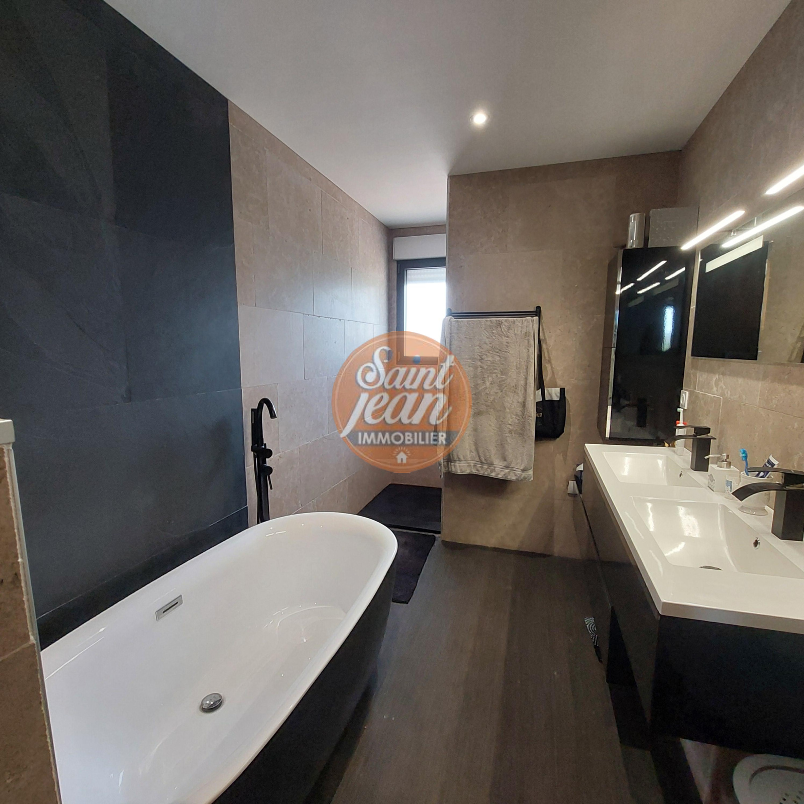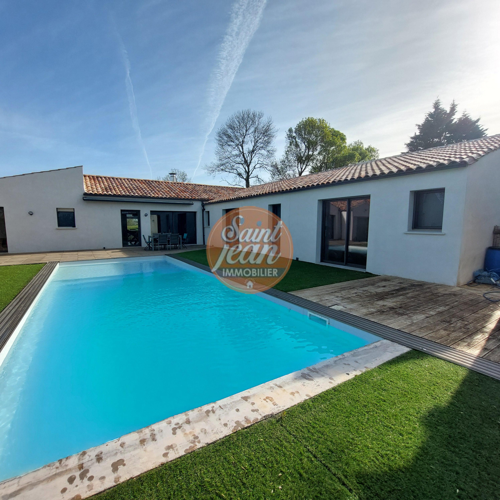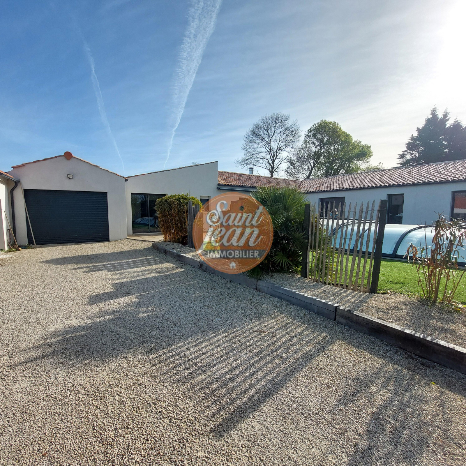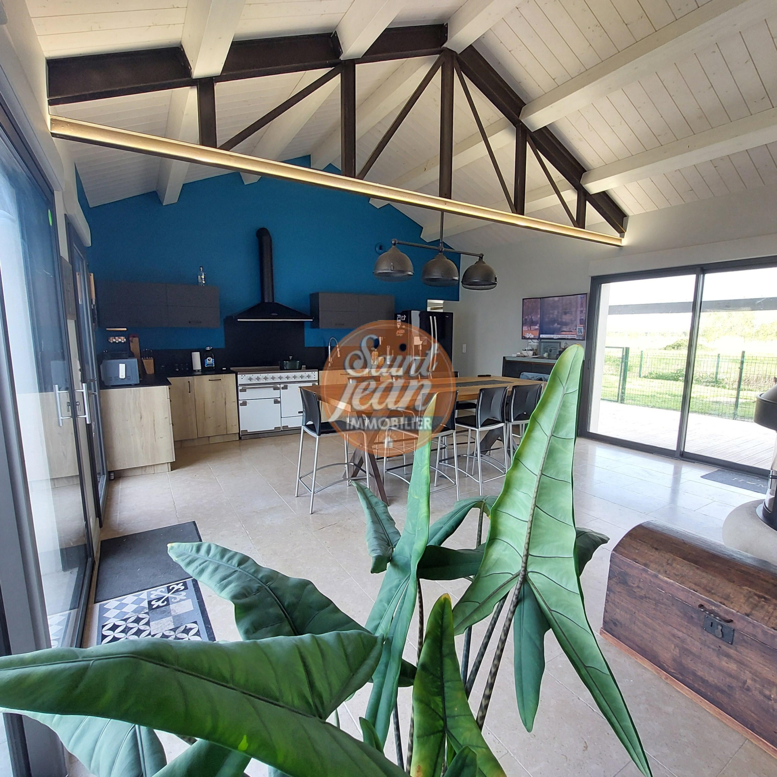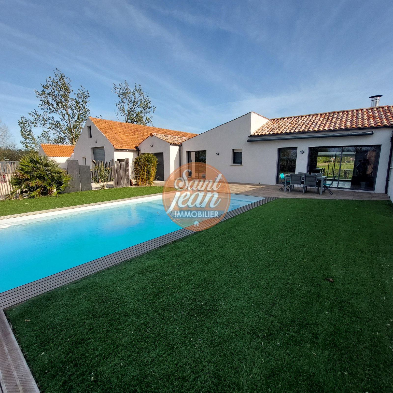 A seulement 3 mns des hypermarchés de St Jean de Monts, magnifique propriété de 180 m² comprenant une spacieuse pièce de vie avec cheminée centrale, une suite parentale avec dressing et salle de bains.